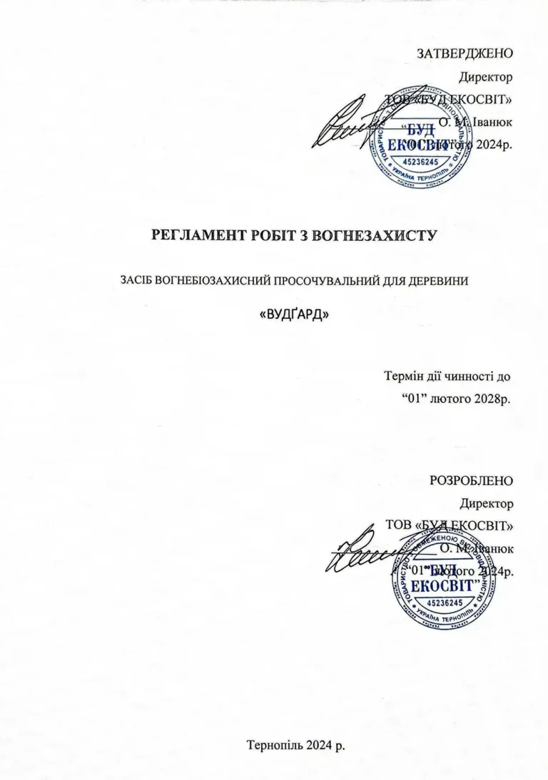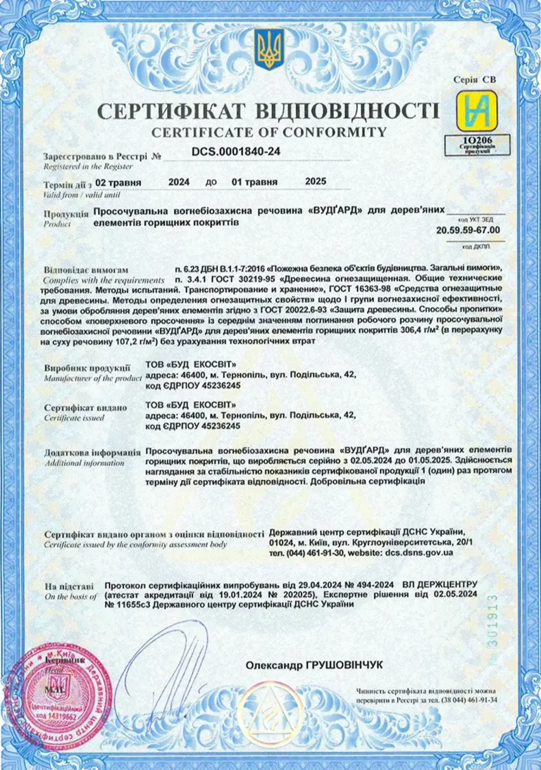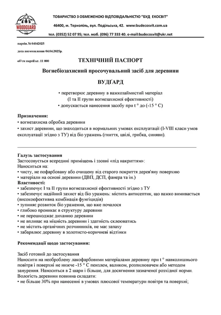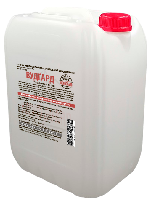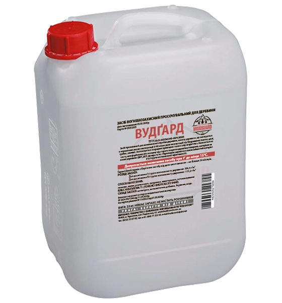 Woodguard — це високоякісний антипірен, розроблений для глибокого проникнення в деревину з метою зниження її займистості.